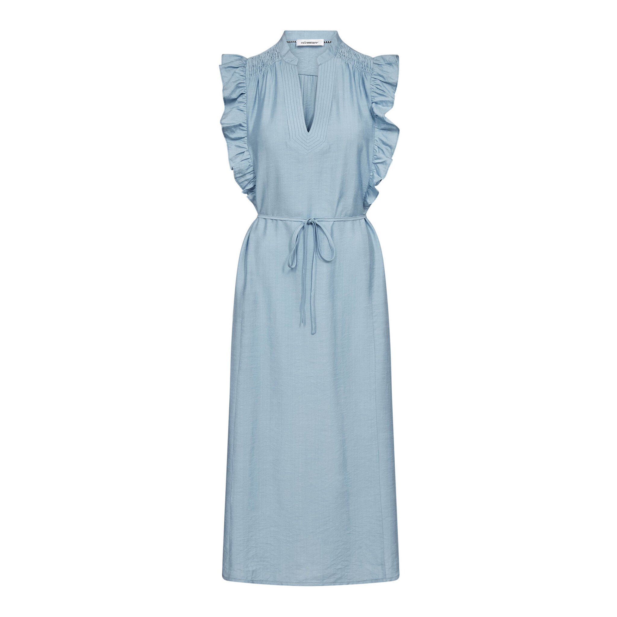 De Co Couture Hera Frill SS V-Dress in pale blue heeft een lichte en vrouwelijke uitstraling. De soepel vallende stof geeft de jurk een zachte lijn, terwijl de frisse kleur zorgt voor een rustige en verfijnde look.