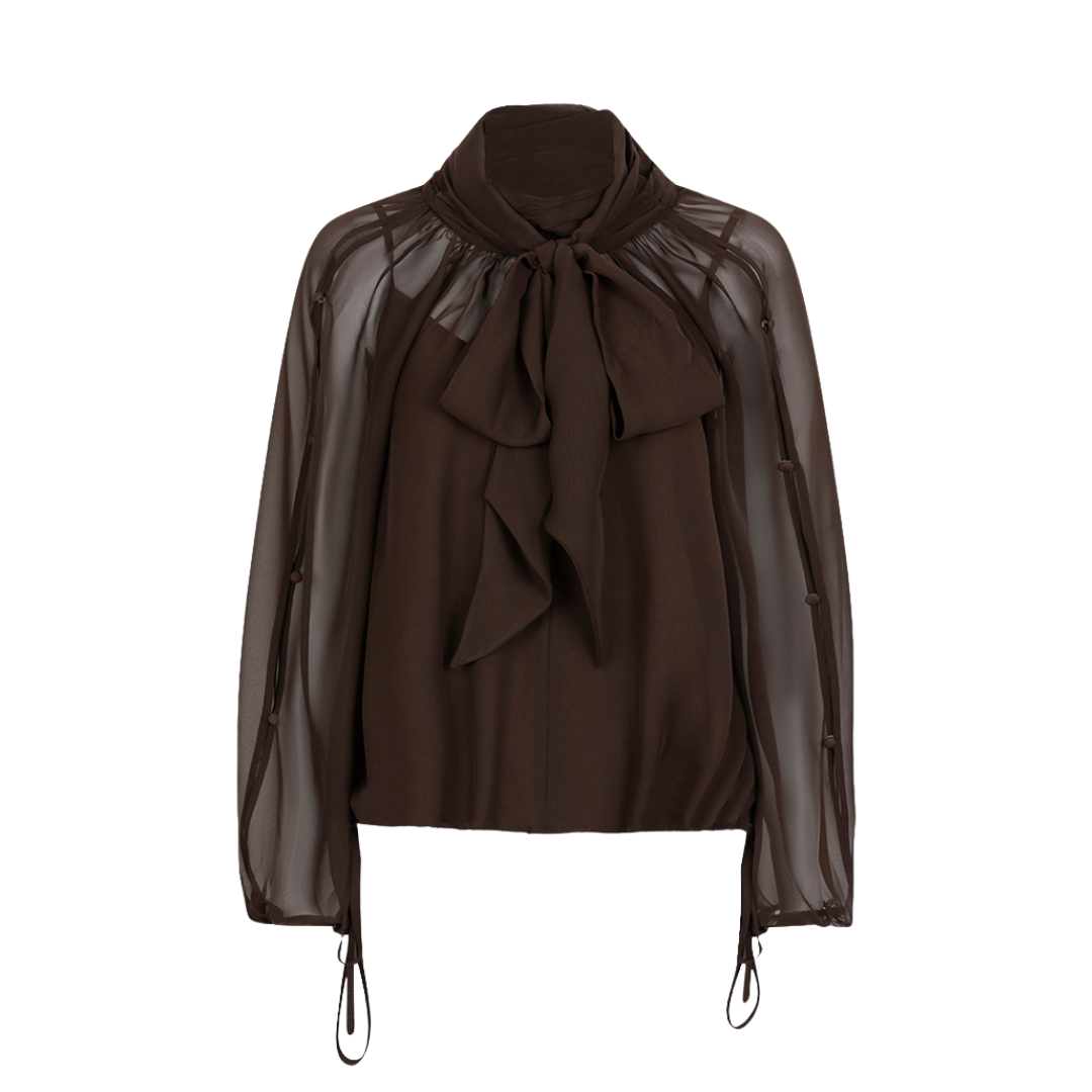 De hoge halslijn met plooidetails en een striksluiting zorgt voor een elegante uitstraling. De volumineuze pasvorm en de splitdetails op de mouwen geven de blouse een speelse, boho-geïnspireerde look. Met stof beklede knopen langs de mouwen maken dit ontwerp extra verfijnd.