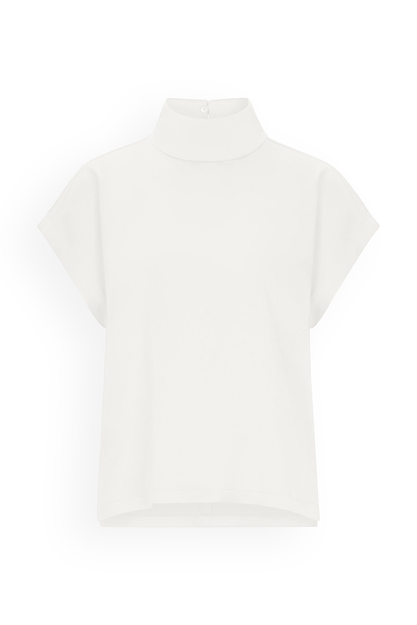 De top heeft een relaxed fit en een H-lijn, waardoor het silhouet recht en soepel langs het lichaam valt. De korte, oversized mouwen en de opstaande kraag zorgen voor een krachtige en eigentijdse uitstraling. De knoopsluiting geeft het ontwerp een klassieke afwerking. De hoogwaardige satijnstof met 96% acetaat en 4% elastaan voelt zacht aan, valt soepel en heeft een subtiele glans.
