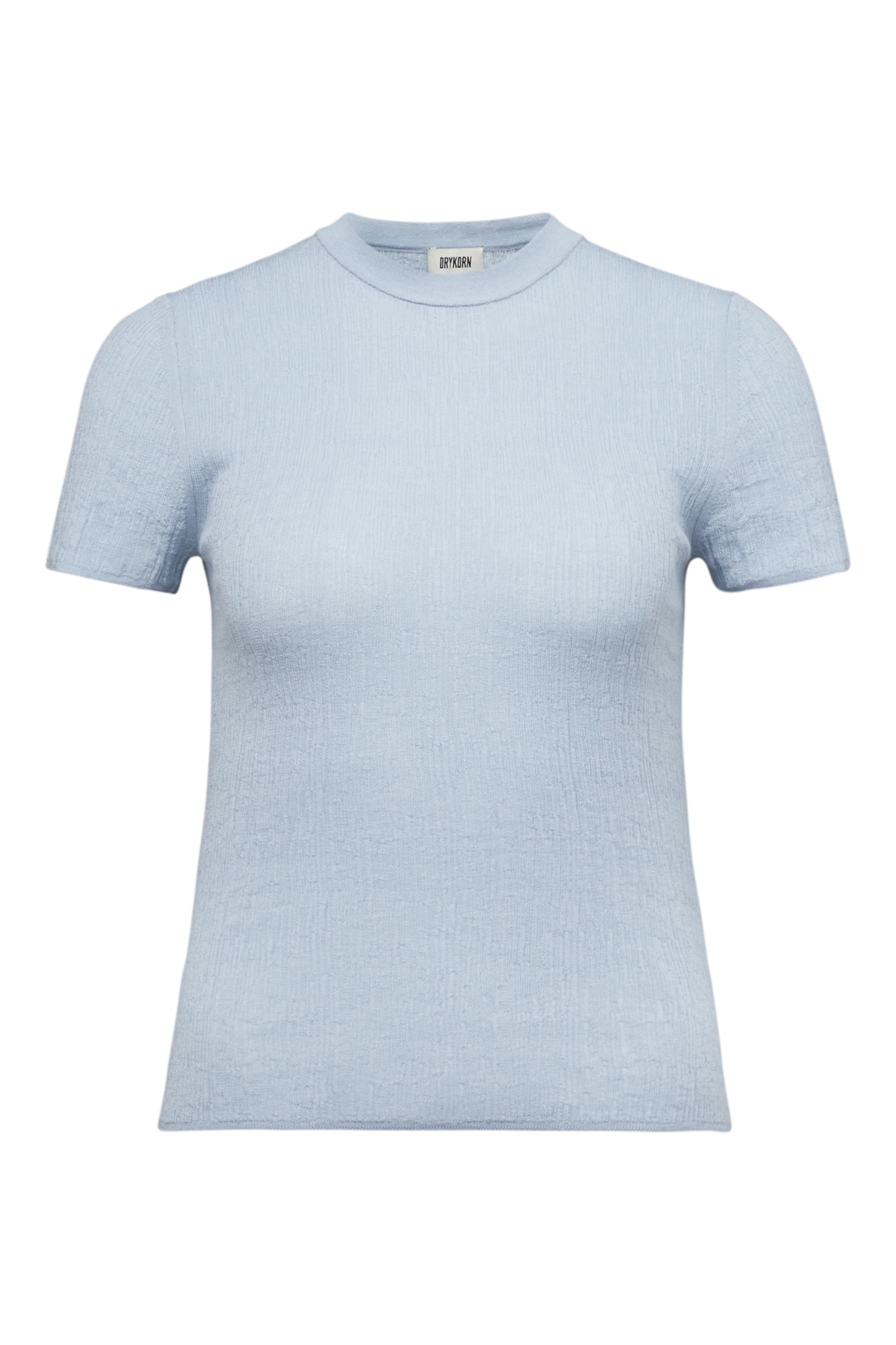 Het model heeft een ronde hals en korte mouwen, gecombineerd met een aansluitende pasvorm die het silhouet mooi volgt. De fijne ribbrei geeft het T-shirt een moderne en verfijnde uitstraling en zorgt tegelijkertijd voor extra comfort.