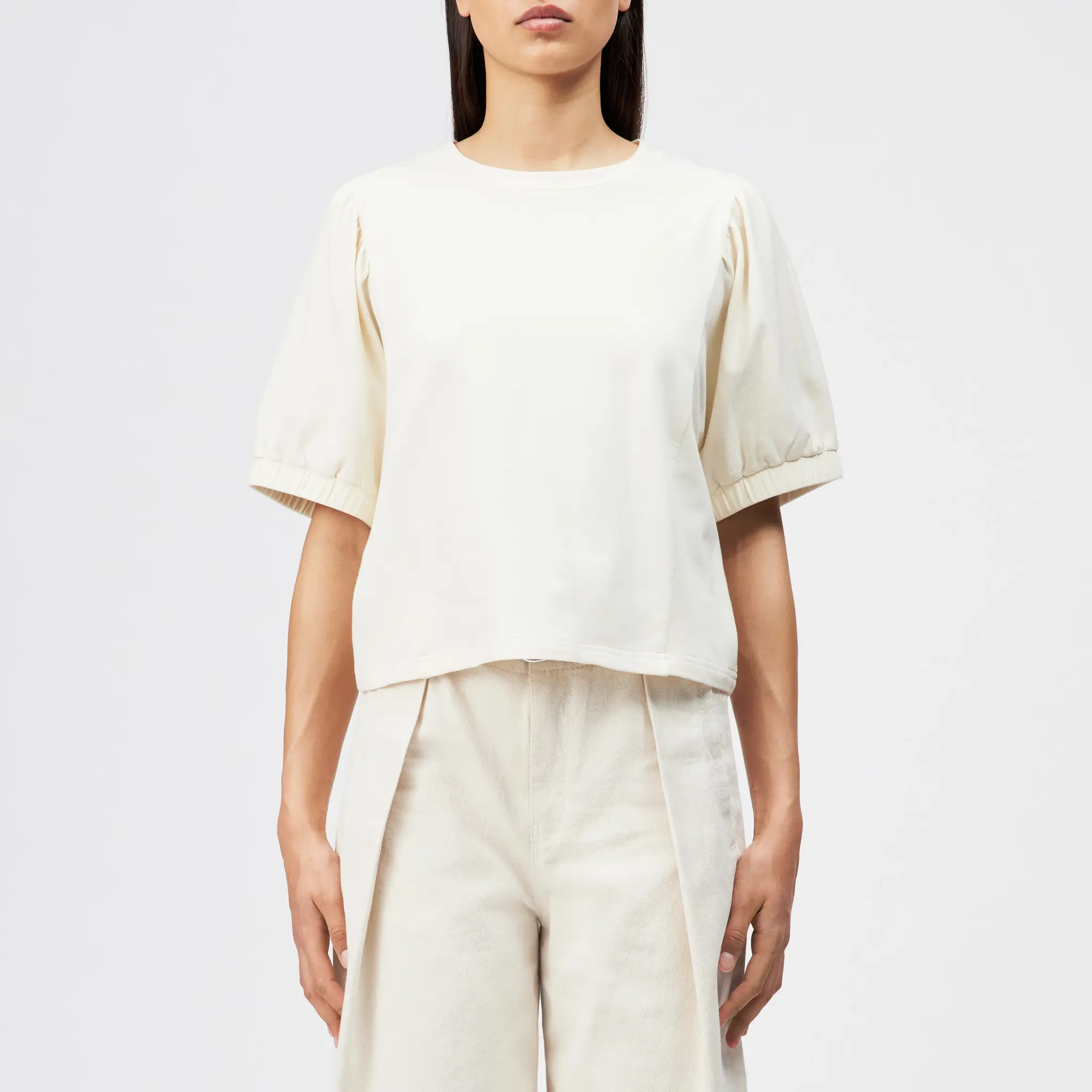 Het model heeft een ronde hals, korte mouwen en een relaxed fit met een lichte O-shape. De deelnaadjes en plooien geven het ontwerp een elegante, vrouwelijke touch en zorgen voor een mooie, losvallende pasvorm.