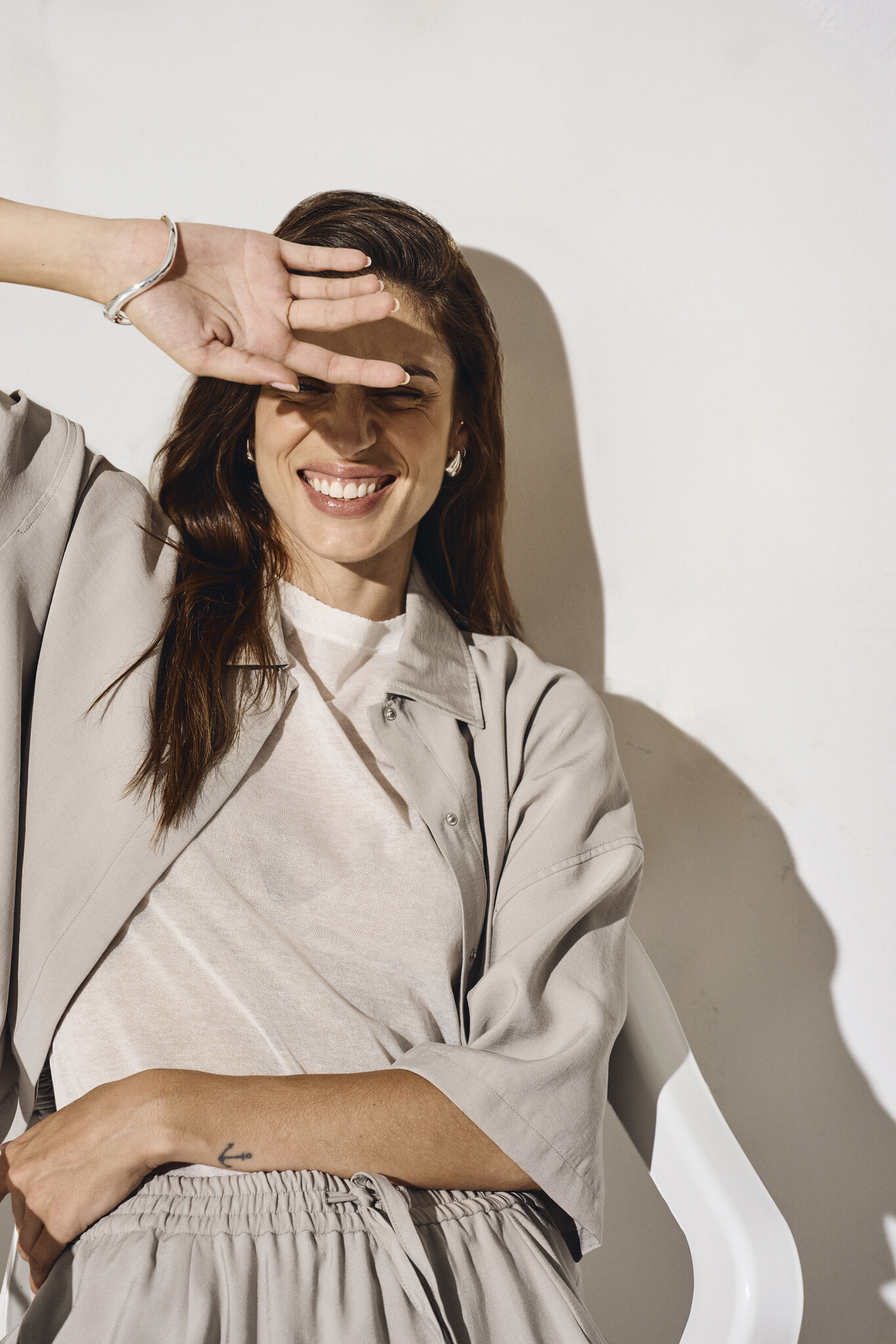 De twill van modal en polyester voelt zacht aan op de huid, valt soepel en heeft een subtiele glans die de blouse een luxe uitstraling geeft. De neutrale grijze kleur maakt dit item gemakkelijk te combineren met zowel een pantalon als een jeans.
