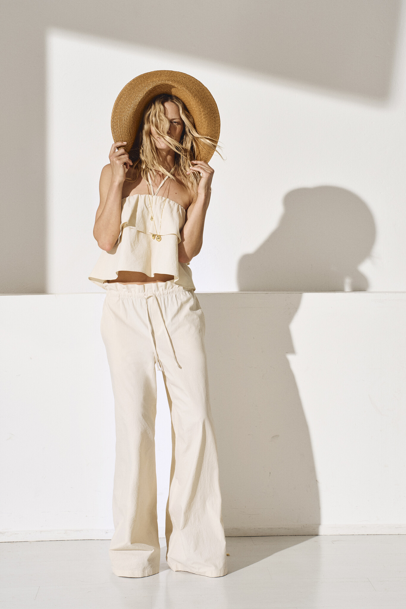 De top heeft een bandeauhals met halterbandjes die in de nek gestrikt worden. De gelaagde volant zorgt voor een soepel vallend silhouet en een speels effect. Dankzij de A-lijn pasvorm valt de top losjes langs het lichaam en creëert het een ontspannen, stijlvolle uitstraling.