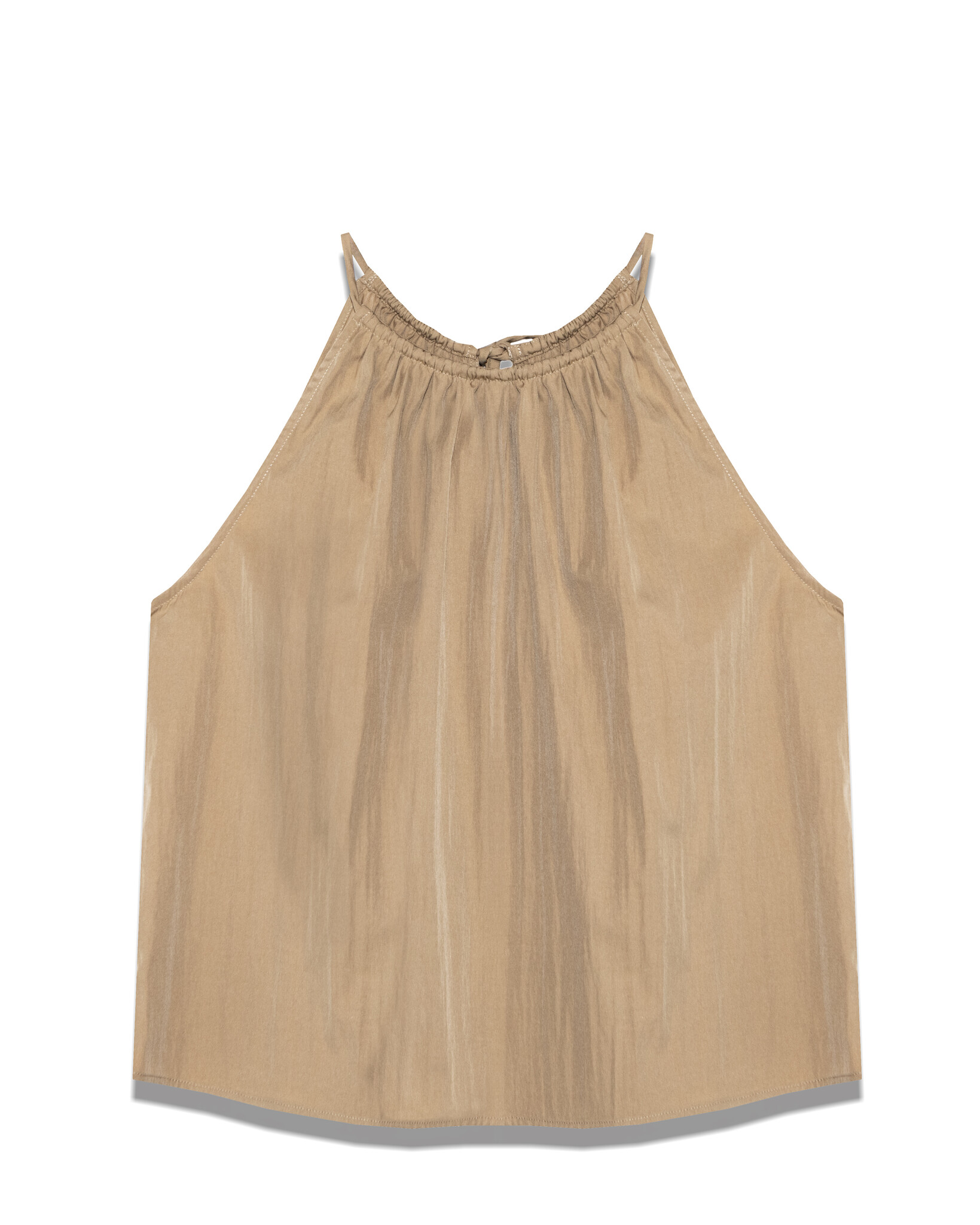 Deze halterneck top van Milla in de kleur gold heeft een elegante en vrouwelijke uitstraling. De geplooide halslijn en verfijnde bandjes zorgen voor een zachte valling en een mooi gevormd silhouet. De licht glanzende stof voelt soepel aan en draagt comfortabel. Een stijlvol item dat perfect combineert met een bijpassende rok of een elegante pantalon voor een verzorgde, moderne look.