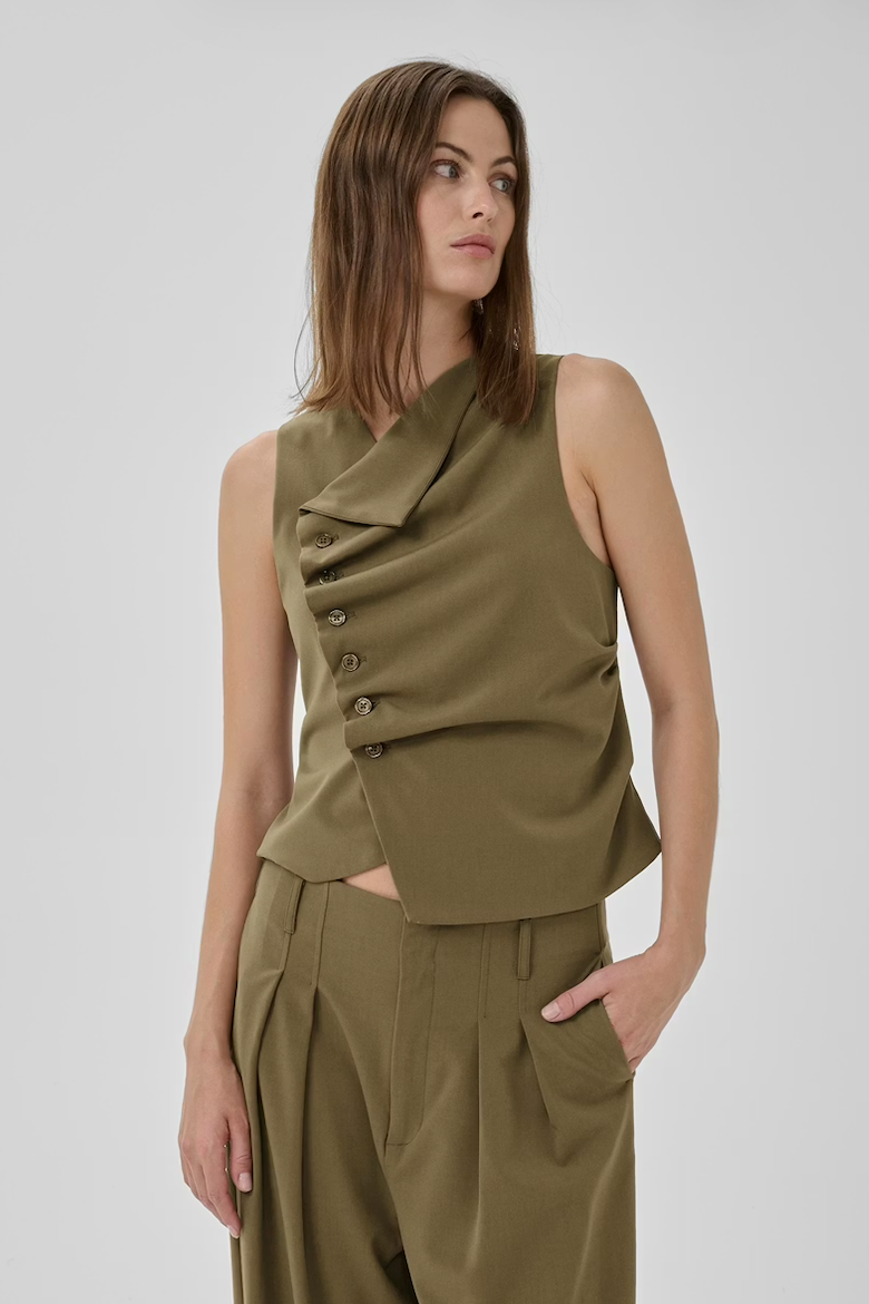 De Hace Top van My Essential Wardrobe in de kleur Capers is een modern mouwloos gilet met een krachtige uitstraling. De diepe groentint geeft het ontwerp een eigentijds karakter en laat zich mooi combineren met een bijpassende pantalon of juist met denim voor een meer casual look.