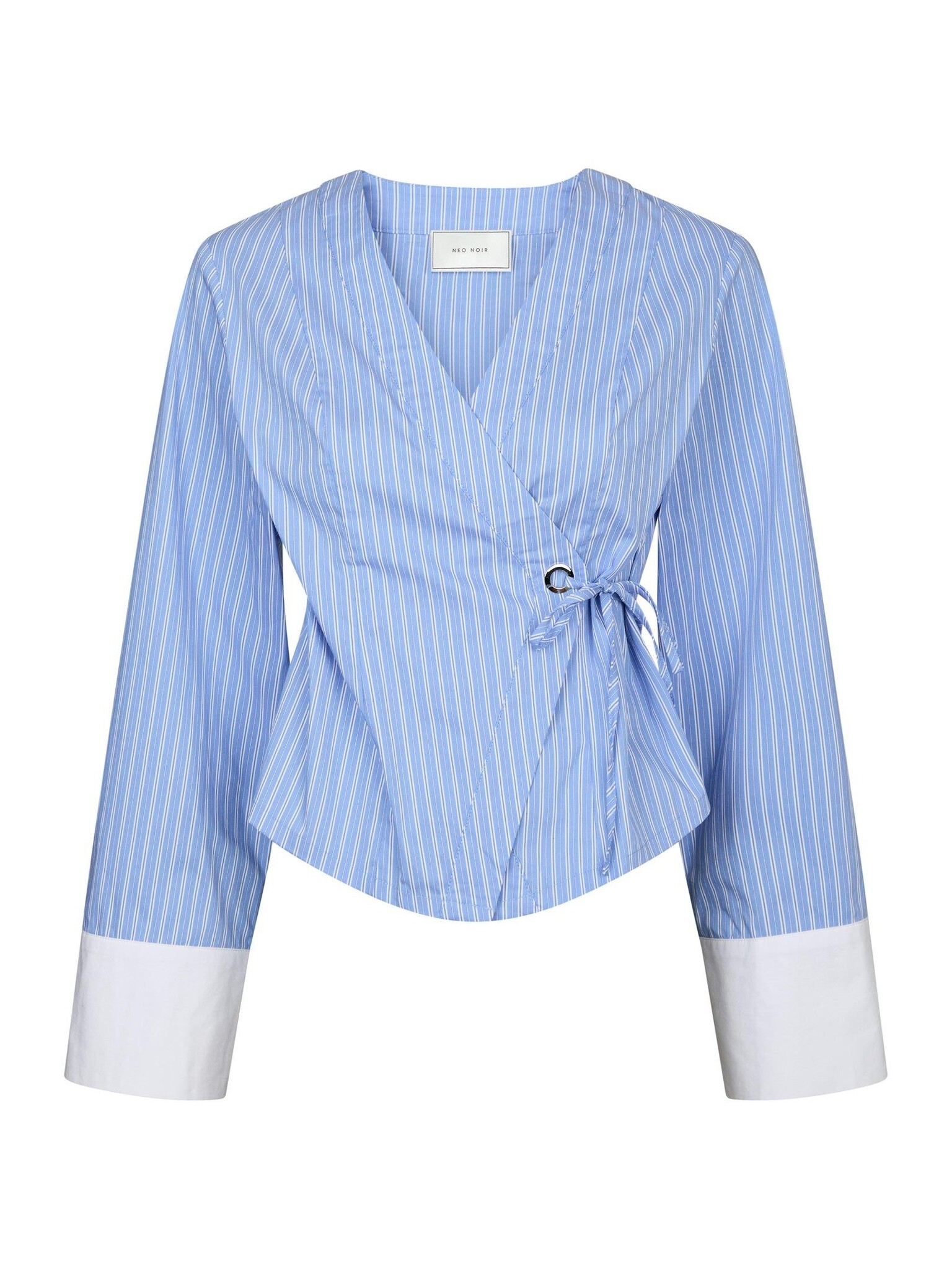 Het Salvia Stripe Shirt van Neo Noir is een vrouwelijk wikkelshirt in een frisse, lichtblauw gestreepte poplinkwaliteit. Het model sluit met een strik aan de zijkant en heeft een licht aansluitend silhouet dat de taille mooi accentueert. Gemaakt van een stevige, maar soepele katoenmix die fijn draagt op warme dagen en zorgt voor een verzorgde uitstraling zonder stretch.