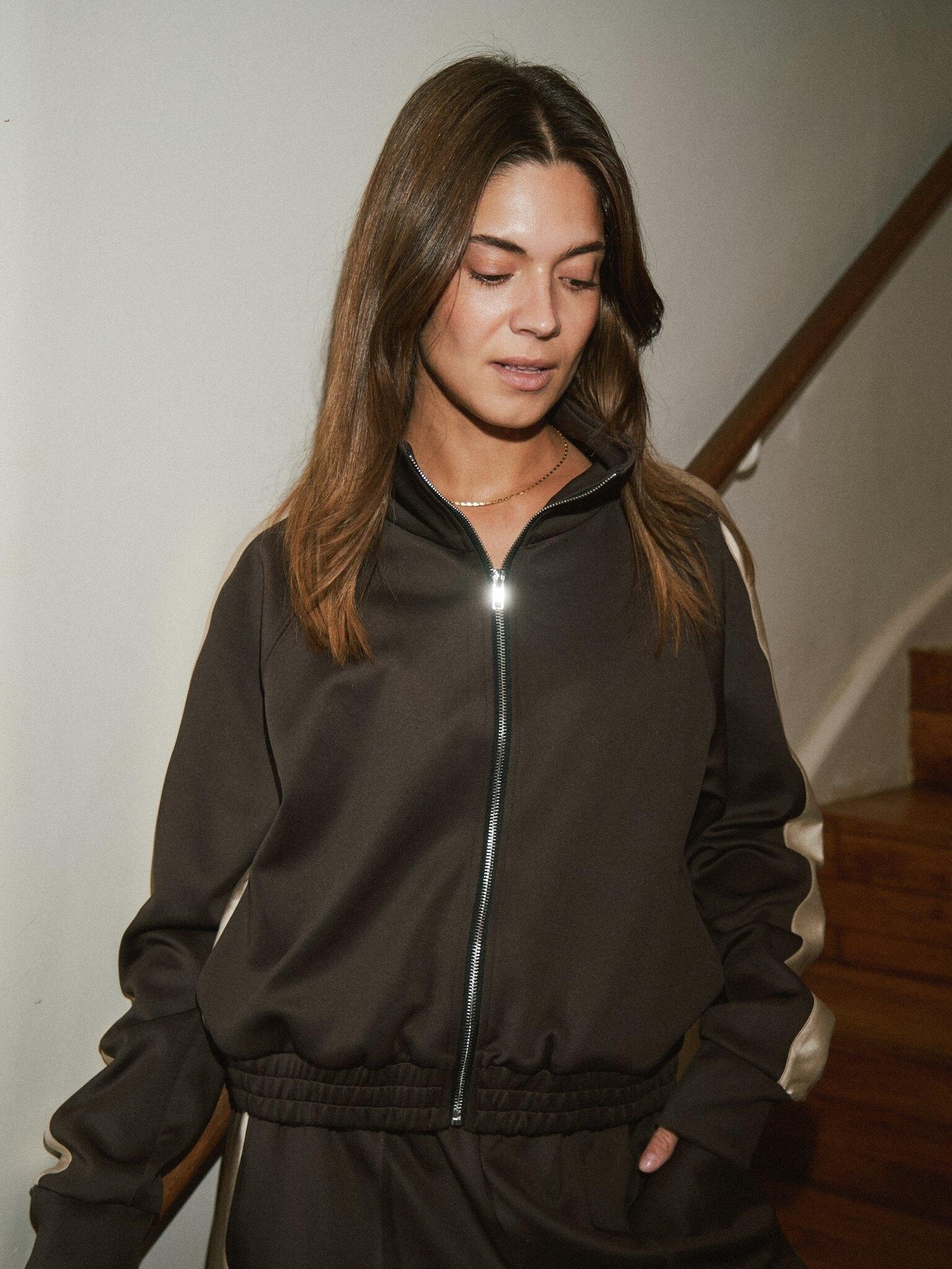 Het ontwerp heeft een ritssluiting aan de voorkant en contrasterende streepdetails langs de mouwen voor een sportieve twist. De cropped lengte maakt het jack ideaal om te combineren met high-waist broeken of rokken. Voor een complete set is de blouse ook perfect te stylen met de bijpassende track pants, maar los dragen kan natuurlijk ook.