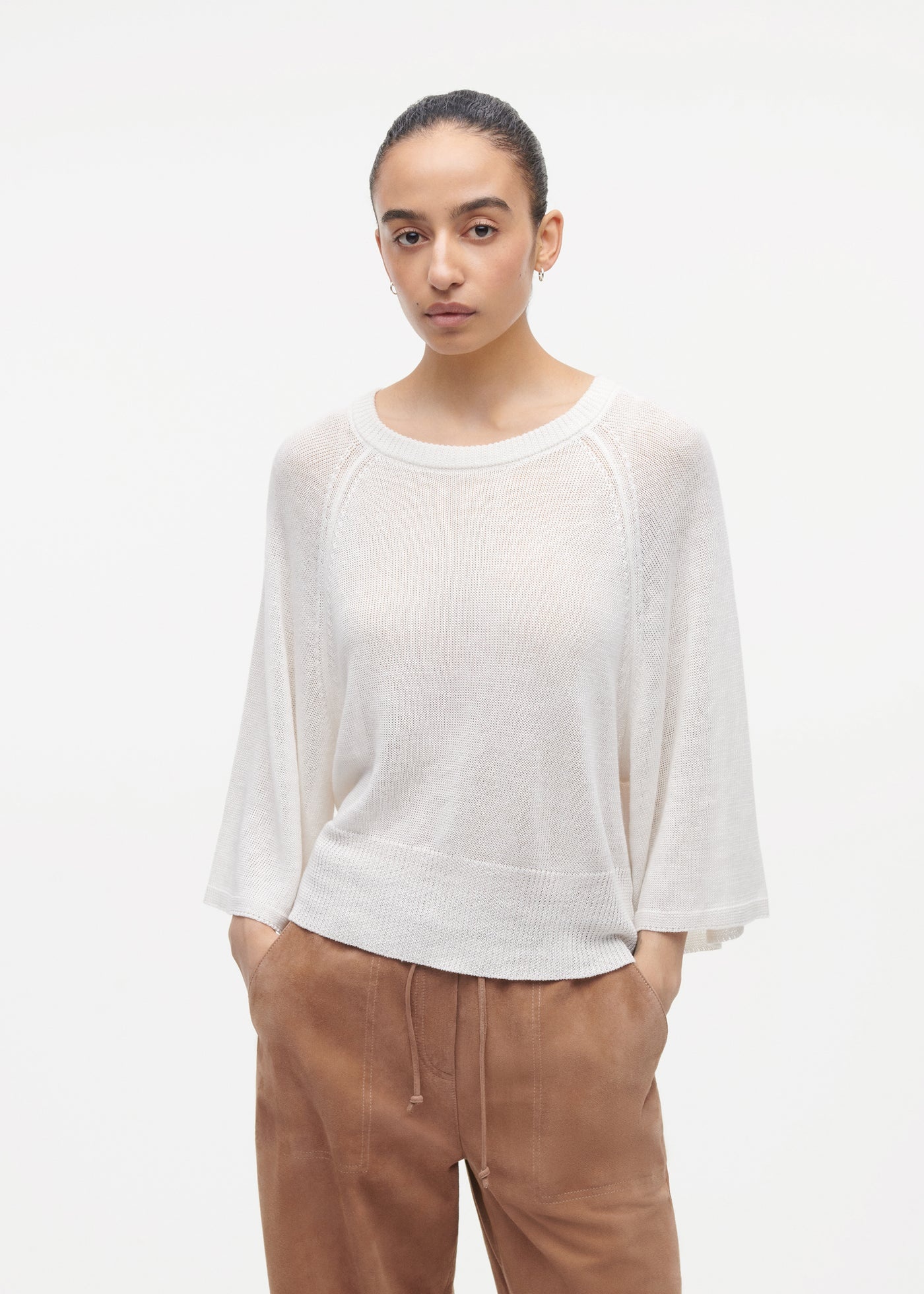 De top heeft een ruimvallend model met driekwart mouwen, wat zorgt voor een nonchalante en moderne belijning. Dankzij de oversized pasvorm valt het model los om het lichaam en biedt het veel bewegingsvrijheid. De zachte ecru tint maakt deze top veelzijdig en eenvoudig te combineren met zowel neutrale als warmere kleuren.